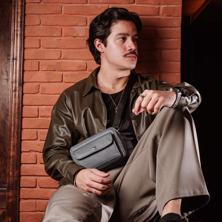 Confeccionada en piel genuina con grabado rondinelo en un tono gris cemento, con un ligero brillo que aporta elegancia y carácter. Su diseño mantiene la esencia moderna con un toque más serio y sofisticado gracias a la combinación de herrajes en un fino acabado negro brilloso, los cuales realzan su presencia y personalidad. El tono y la textura de la piel pueden variar entre 5%-15% debido a su naturaleza genuina.