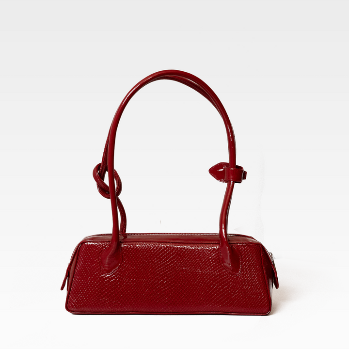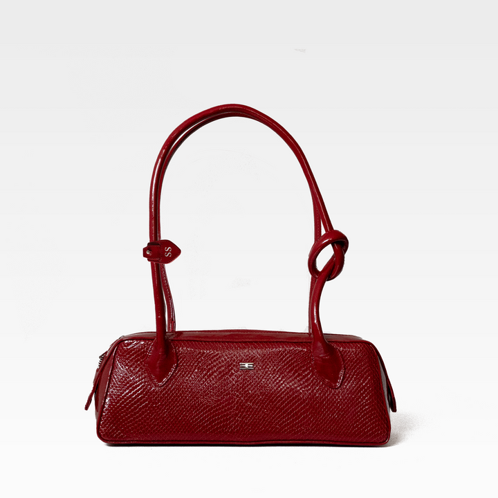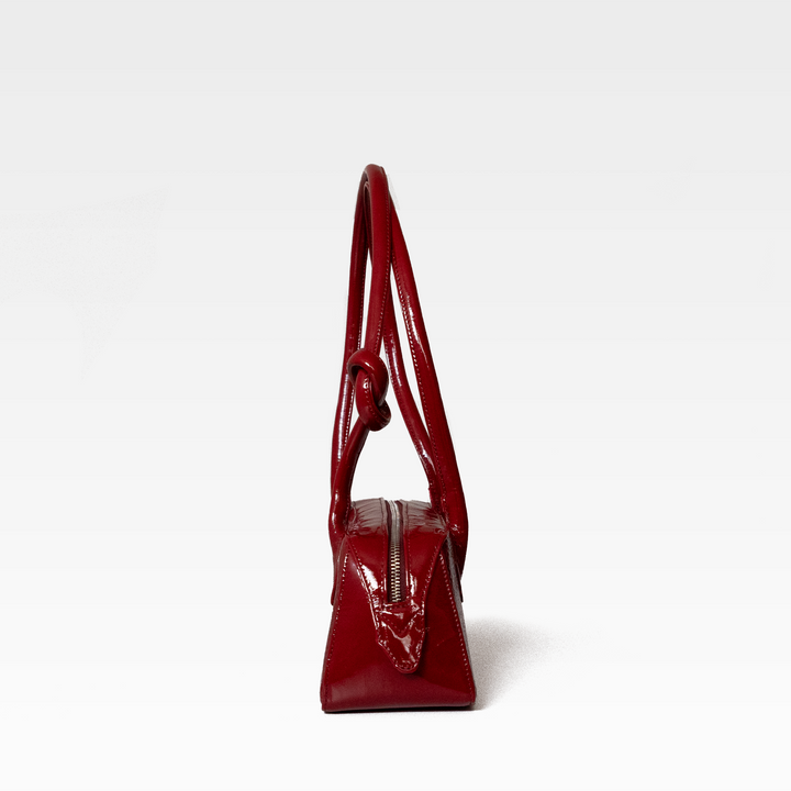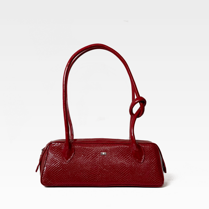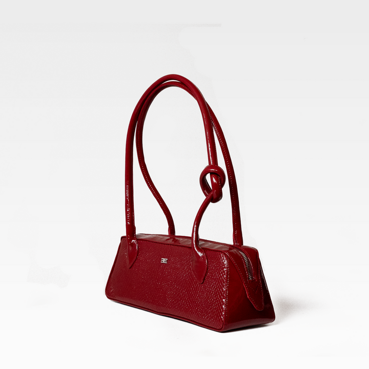 Shoulder bag en piel 100% genuina con acabado charol rojo intenso. Un diseño alargado y elegante que destaca por su carácter atrevido y sofisticado.