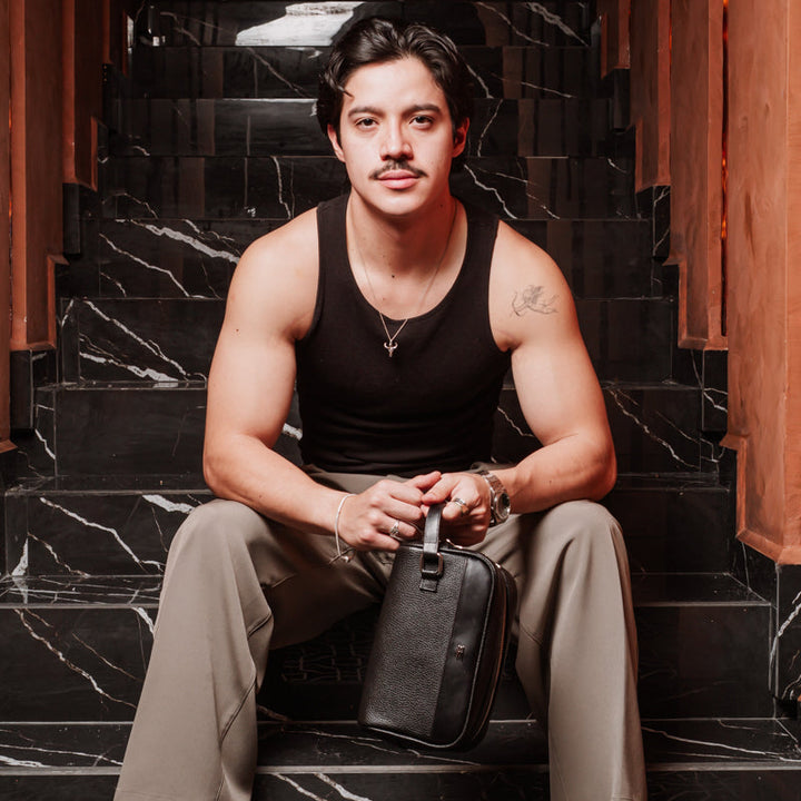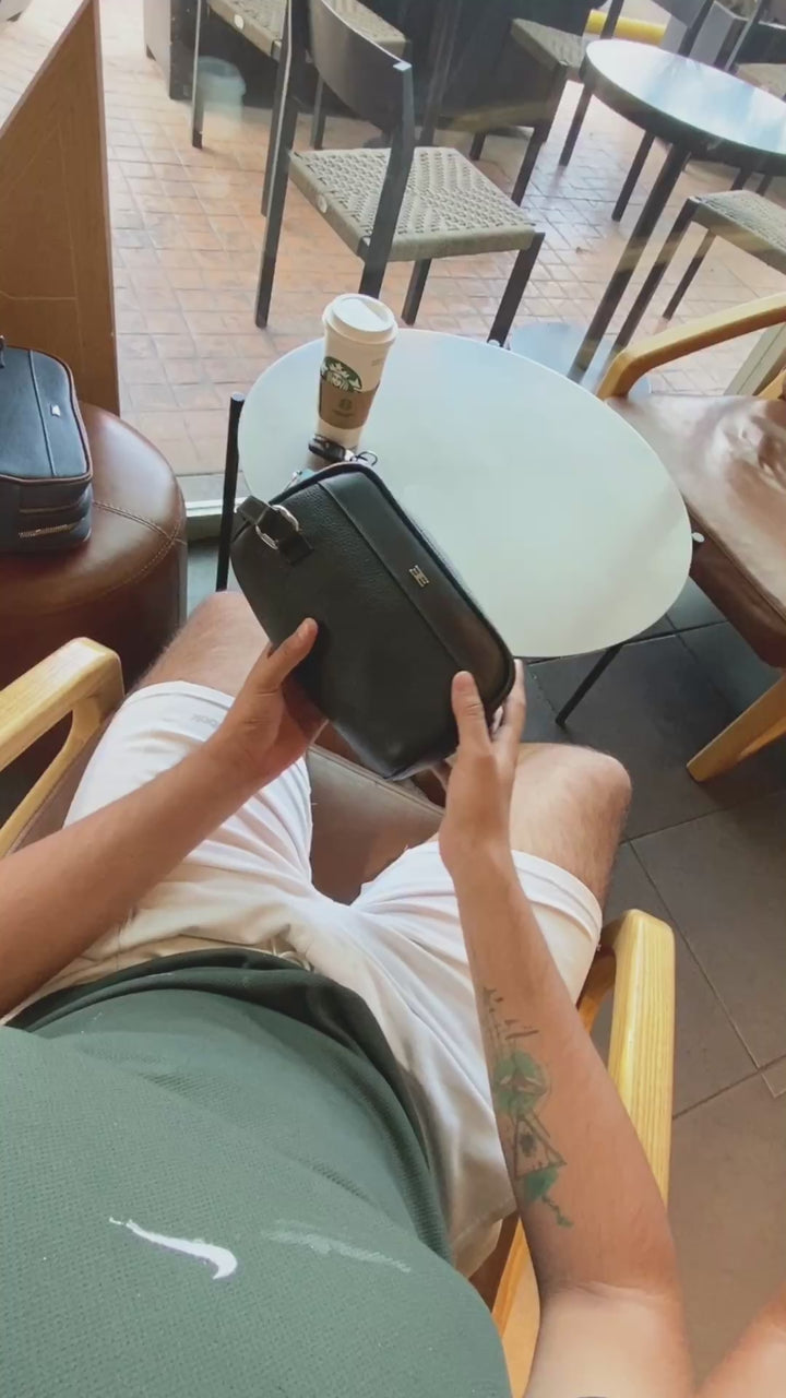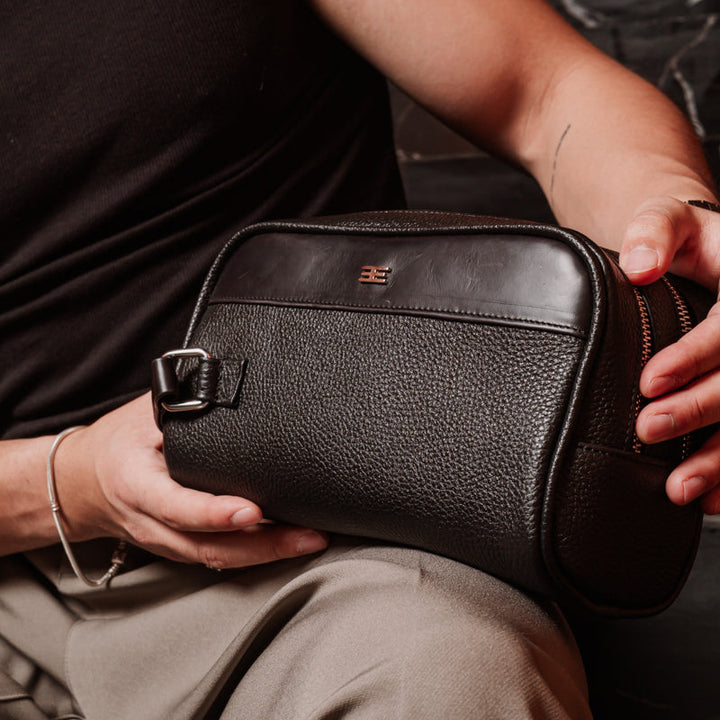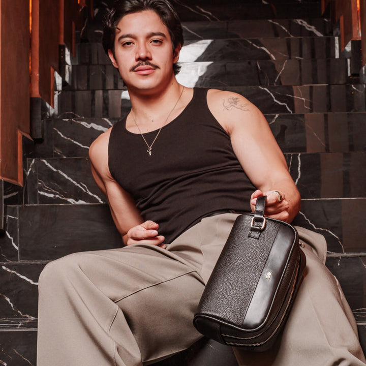 Neceser de piel genuina combinada en dos texturas: una piel grabada con carácter y una piel lisa de tacto suave y premium. Su diseño compacto y moderno lo convierte en un accesorio práctico y elegante para uso diario, viajes o rutina de trabajo.